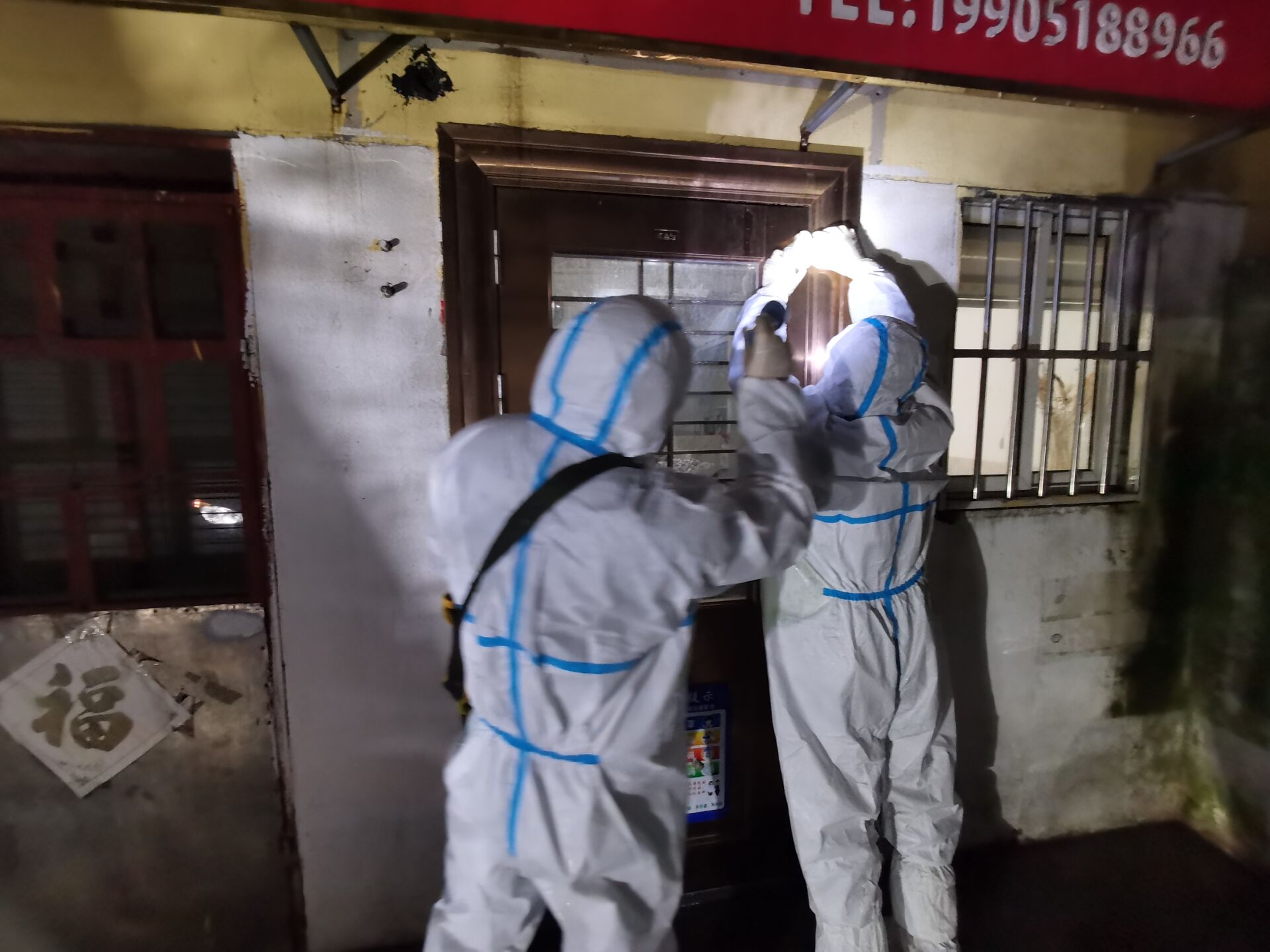 由于新橋社區多為自建房,門牌號混亂難找,房地產和資產公司的志愿者們冒雨堅守,逐戶排查登記信息,宣傳防護知識,講解防控要求,并對重點監控住戶安裝防疫門磁。