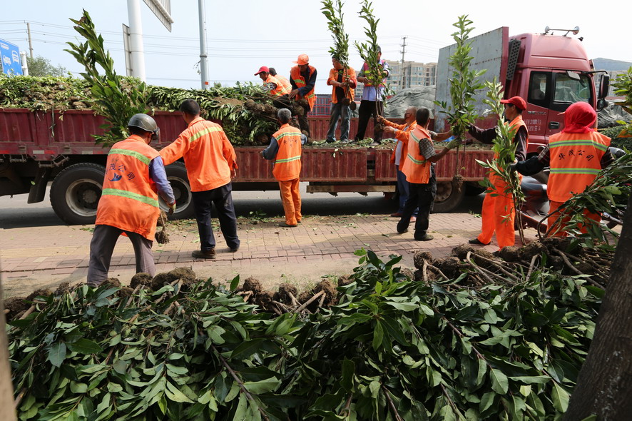 新光路鐵路橋至港城大道段南側(cè)綠化帶,因為人為踩踏、車輛碾壓導(dǎo)致綠化斑禿損壞嚴(yán)重,為盡快恢復(fù)綠化原貌,改善市容市貌。8月18日,裕升、裕欣養(yǎng)護(hù)公司組織80多名綠化工,從早上6點一直干到下午6點,卸苗、運(yùn)苗、挖坑、插苗,烈日酷暑下奮戰(zhàn)一整天,中午在樹陰下吃點盒飯,喝點礦泉水,繼續(xù)工作,橘黃色工作被汗水浸透、被烈日烤干,這樣有好幾個來回。“今天我們要在這片綠化補(bǔ)植紅葉石楠、金森女貞等模紋小苗1萬余株,紅葉石楠球等灌木110株,有效改善該路段綠化植被,提升城市形象,我們還要在黃海續(xù)道補(bǔ)植草坪近30000平方,在這條1000多米長的路段,有車輛維修點50多家,車輛出入,對路邊綠化帶傷害非常大,這一路段也是環(huán)衛(wèi)整治長期存在的‘老大難’,這次,在開發(fā)區(qū)行政執(zhí)法部門的配合下,我們要重新種植草坪,對這一‘老大難’路段植被進(jìn)行恢復(fù),另外德蘭南路、東路補(bǔ)植苗木近80萬元的綠化工程也已開工上土整土,接著要栽苗,根據(jù)開發(fā)區(qū)創(chuàng)衛(wèi)部署要求,上述這些事情必須在8月底完成,所以說時間相當(dāng)緊,職工們都冒著高溫,加班加點搶進(jìn)度。”公司副總經(jīng)理郁宏峰說。