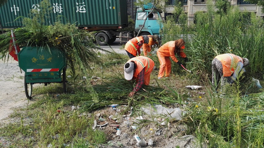 在昌圩湖環(huán)湖路南側(cè)一處公共廁所處,裕升養(yǎng)護(hù)公司20多名環(huán)衛(wèi)保潔工人正在清理公廁周邊的雜草、建筑垃圾,有的在割草、有的在搬磚、有的在推車,一個個汗流浹背,忙得不亦樂乎。正在現(xiàn)場忙碌的保潔大隊長劉保軍對筆者說:“這一塊段還沒有交給我們養(yǎng)護(hù),一直無人管理,雜草叢生,成為建筑、裝修垃圾的堆放地,根據(jù)開發(fā)區(qū)創(chuàng)衛(wèi)環(huán)境衛(wèi)生無死角要求和華茂公司生產(chǎn)技術(shù)部門指令,我們裕升養(yǎng)護(hù)公司承擔(dān)這一區(qū)域環(huán)境衛(wèi)生突擊整治任務(wù),從綠化保潔班組抽調(diào)20多人來搞突擊,大家面對天氣炎熱、工作量大、清理困難等因素,發(fā)揚(yáng)不怕吃苦、敢打硬仗的華茂精神,奮戰(zhàn)在突擊現(xiàn)場,每個人都汗流不止,工作服全被汗水浸透,昨天我們已在這里整整干了一天,由于垃圾量大、雜草面積大,我們動用了裝載機(jī)等機(jī)械設(shè)備,運(yùn)雜草的三輪車跑近百趟,清理建筑、裝修等垃圾數(shù)十噸。估計今天下午能夠全部結(jié)束。”