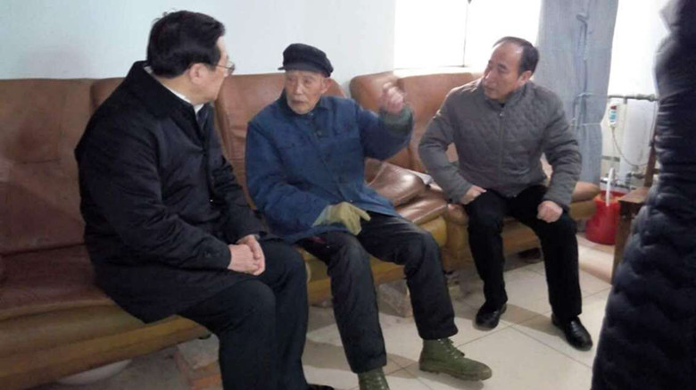 1月20上午,省總工會副主席曹海(右一)、市總工會主席李強(左一)一行來到公司全國勞模、百歲老人鄭有根家中走訪慰問,不僅帶去了慰問品和慰問金,也帶去了黨委、政府以及工會組織的問候和溫暖。集團公司工會副主席李嵐琴、公司黨委書記、經理孫政權等陪同慰問。(司宣 司工)
