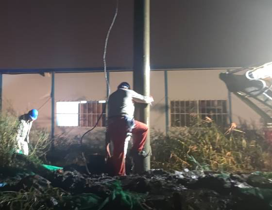 今年的10月天氣還是熱的厲害,電桿被太陽(yáng)曬的滾燙,搶修人員臉上掛滿了豆大的汗珠,工作服已經(jīng)全部濕透。為了搶時(shí)間,抓進(jìn)度,作業(yè)人員們?nèi)徊活櫍廊痪o張有序地工作著。現(xiàn)場(chǎng)搶修工作涉及吊車、挖掘機(jī)等大型施工機(jī)具,安全管控尤為重要,現(xiàn)場(chǎng)所有搶修人員在工作負(fù)責(zé)人的指揮下平穩(wěn)有序的推進(jìn)搶修工作,吊車擺放位置、挖掘機(jī)挖桿洞的位置等每一個(gè)關(guān)鍵工作點(diǎn)都在搶修人員的嚴(yán)格監(jiān)督下進(jìn)行,不敢有絲毫松懈。就在這時(shí),天公不作美,突然下起了大雨,可是大雨并沒有攔住搶修工作。臺(tái)北供電所現(xiàn)場(chǎng)所有的搶修人員在錢所長(zhǎng)的帶領(lǐng)下,穿著濕透的工作服在雨中指揮挖掘機(jī)開挖桿洞、組立電桿、連接導(dǎo)線-------搶修人員在天昏地暗的雨中穿梭,雨水和汗水交匯在電力搶修人員的臉龐上,大家都來(lái)不急擦拭一下臉上的雨水,在雨中忙碌著。經(jīng)過4個(gè)半小時(shí)的緊張有序搶修,晚上19:30分10KV港北線恢復(fù)供電。