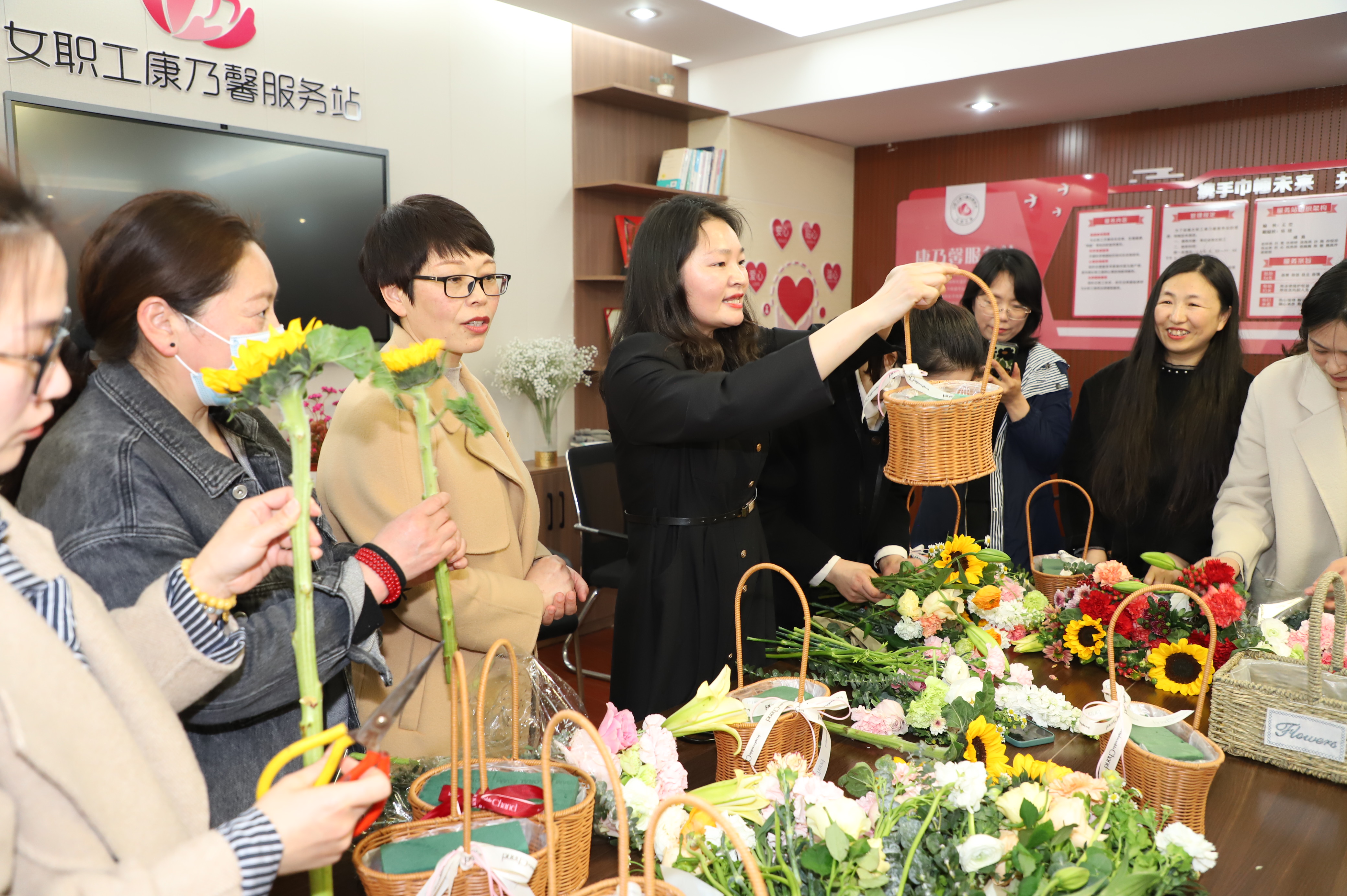 隨后開展的藝術(shù)插花活動,更是將節(jié)日慶祝氣氛推向了高潮。活動現(xiàn)場,邀請專業(yè)插花老師進行現(xiàn)場指導(dǎo),插花老師用通俗易懂的語言講授插花基本技巧,從顏色的搭配、花枝長短的修剪以及造型等方面進行細致講解,大家也紛紛行動起來,構(gòu)思設(shè)計,在老師的指導(dǎo)下將各種花材修剪和整枝,忙的不亦樂乎。一盆盆姿態(tài)各異的花在女神們靈巧的雙手下陸續(xù)誕生,形成了一幅幅獨具匠心又飽含深意的插花作品。感受節(jié)日美的“她”,看著自己親手創(chuàng)作的插花作品,參與活動的30多名女職工感到滿滿的成就感和幸福感,現(xiàn)場一片其樂融融。