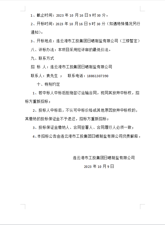 連云港市工投集團日曬制鹽有限公司 海運物流服務業務招標二次公告