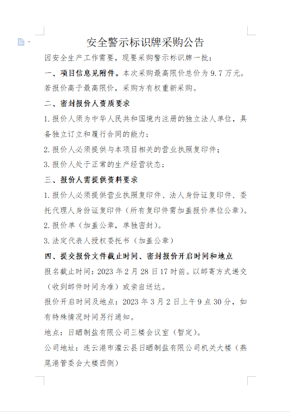 安全警示標識牌采購公告