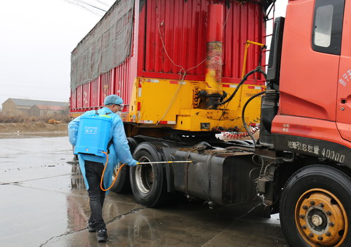 加工鹽車間副主任李畢軍正在對外來車輛進(jìn)行消毒。
