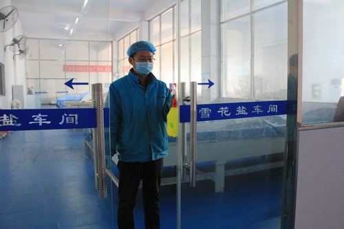 雪花鹽車間主任助理萬平正在對車間關(guān)鍵區(qū)域進(jìn)行消毒。