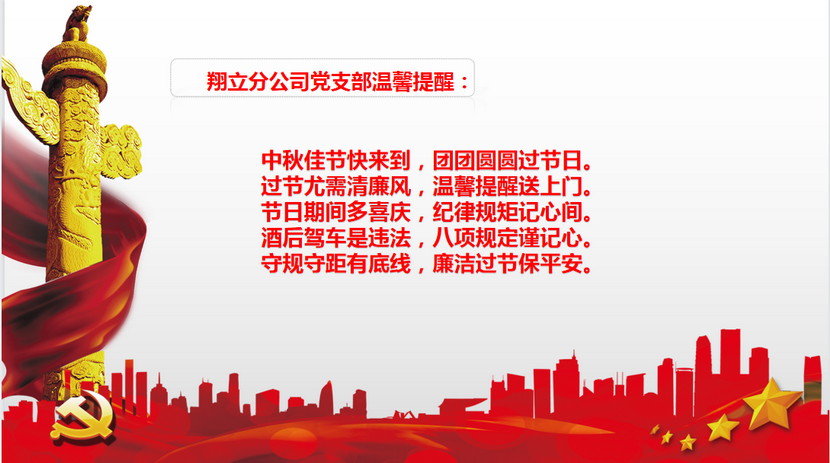 ? ? 為筑牢廉政“防火墻”,確保佳節(jié)期間風清氣正,9月5日,翔立分公司黨支部通過微信向全體黨員干部職工發(fā)送廉潔小短信,提醒全體職工拒腐戒奢,廉潔過節(jié)。