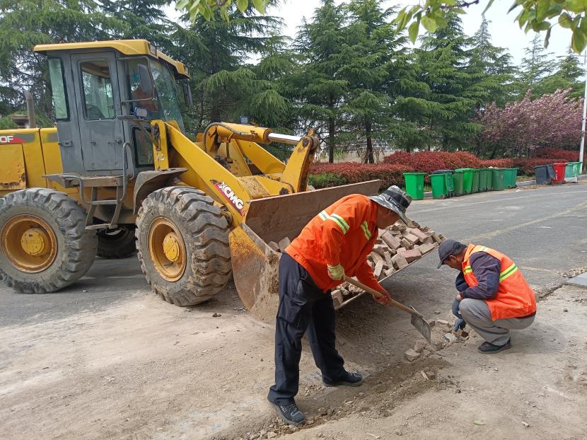 項目開工前,盛達(dá)市政分公司召開中科院提升改造專項會議,根據(jù)各單項工程落實安全生產(chǎn)責(zé)任制,分班組劃片區(qū),并對隱蔽工程、交叉作業(yè)項目制定專項施工方案。該項目工期僅 30 天,由于工期緊,任務(wù)重,施工人員正在開足馬力搶時間、趕進(jìn)度,在項目施工現(xiàn)場,原道磚清除、舊電纜拆除、新建道路基礎(chǔ)墊層、路牙石鋪設(shè)等各施工任務(wù)同步開展,挖掘機、裝載機、貨車等各種工程車輛有序穿梭,各施工現(xiàn)場圍擋、指示牌、路錐等擺放規(guī)范,人員工作服、安全帽等穿戴整齊,確保安全文明施工。