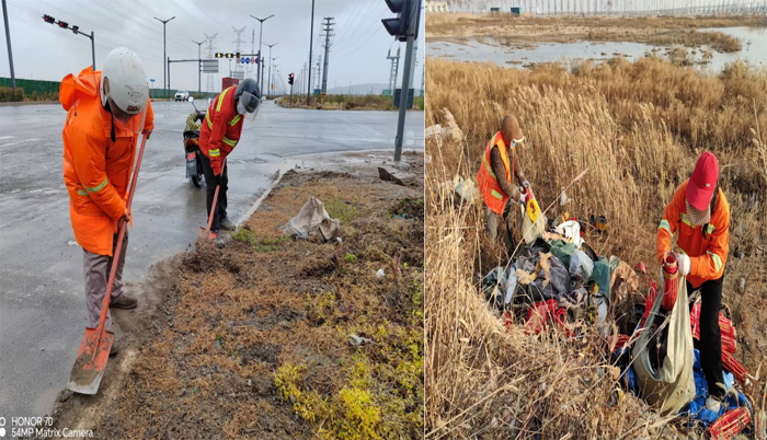 ? ? ? ?突擊處理“一馬當先”。該分公司園區兩個班組雙休期間,及時服從徐圩城建活動保障路線整改要求,強化蘇海路路面兩側施工圍檔,石化三路中風帶護欄清洗力度。班組人員兩人一對,三人一組,無懼徐圩海風吹透身體,揮動手中拖把清洗圍檔,護欄長達1000多米長,清除車輛拋灑積土20余處,用辛勤勞作汗水踐行勞動本色。